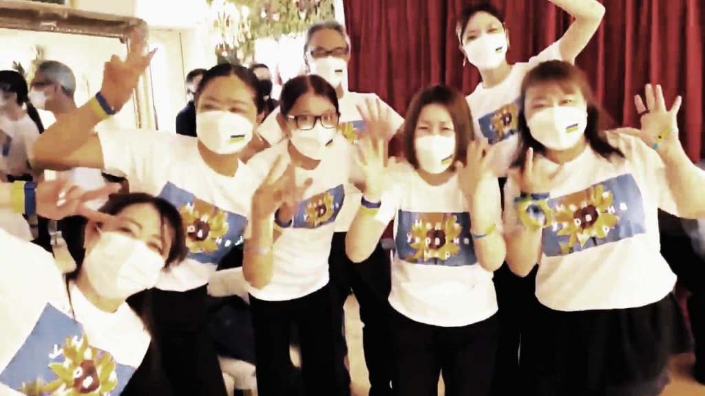 エンディングでは、ヴァレリ先生にサプライズで応援メッセージを送りました。こっそり集まって打ち合わせをして、ウクライナ語サンプル音声でそれぞれ練習を重ねました。「ウクライーナ」の「ラ」を巻き舌で発声すること、「イーナ」部分を伸ばして言うことをポイントに自主練しました。本番でのサプライズは大成功!ウクライナ語の言葉の意味は観客の方々へは理解できなかったと思いますが、ヴァレリ先生にはしっかり伝わっていたと思います。