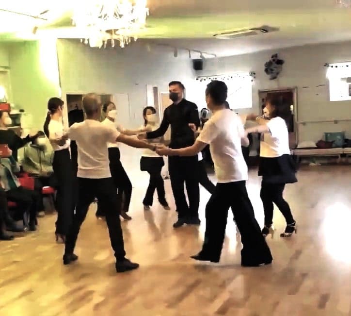 本年3月6日から月1-2回開催している「ウクライナチャリティグループレッスン」に参加してくださっている有志8名によるフォーメーションダンスを発表。振付はもちろんヴァレリ先生です。発表した方々の半分が社交ダンス未経験者でしたが、練習を追うごとに社交ダンスへの情熱も高まっているようでした。発表本番では、チャリティTシャツ、ウクライナリストバンド、ウクライナ国旗が施されたマスクを着用。ウクライナに1日も早く平和な日常が戻ることを願って心を一つに踊りました。